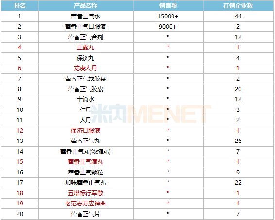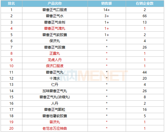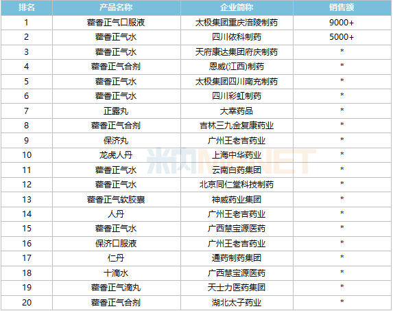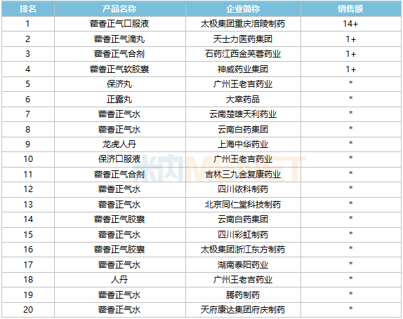 品牌TOP20中,太极集团重庆涪陵制药的藿香正气口服液销售额超10亿元,天士力医药集团的藿香正气滴丸、石药江西金芙蓉药业的藿香正气合剂、神威药业集团的藿香正气软胶囊均超1亿元。