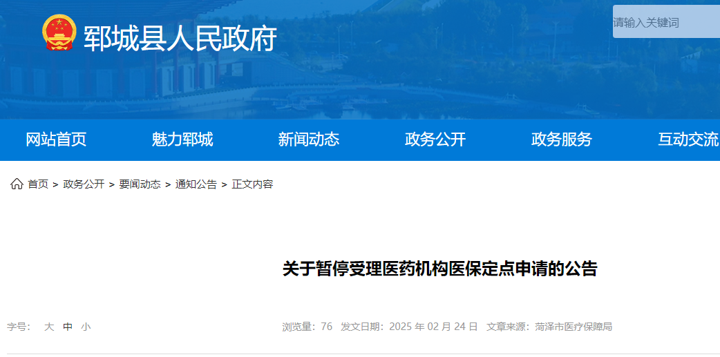 同一天,山东菏泽也发布了相关公告,“建议自2025年3月1日起,暂停全市医药机构(不含一体化管理的村卫生室)新增医保定点的受理工作;期间,已于2025年2月28日前在注册地正式运营已满3个月的医药机构提出医保定点申请的,按原规定受理”。