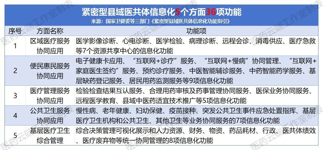 《通知》分为两个部分。第一部分主要功能。包括紧密型县域医共体信息化5个方面36项功能。