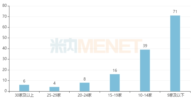 144个符合国采入围门槛的品种中,有18个品种已达到“超强竞争”的程度,符合申报资格企业数达20家及以上,其中有6个品种超过30家,包括头孢唑肟、法莫替丁、二羟丙茶碱3款注射剂,乳果糖、氨溴特罗2款口服液体剂,以及米诺地尔1款外用液体剂。