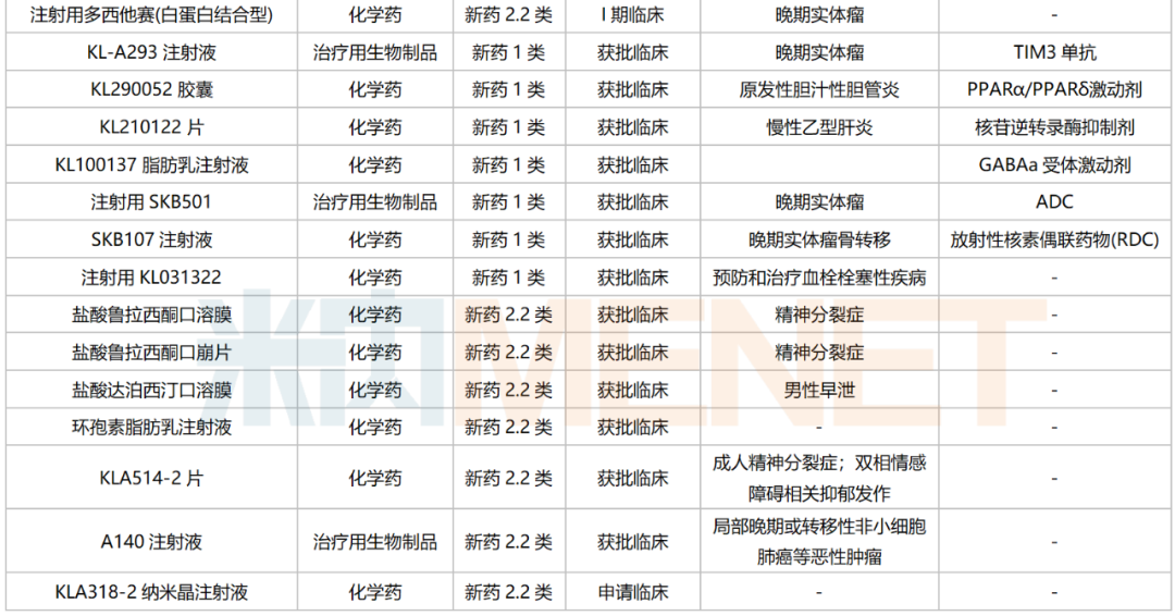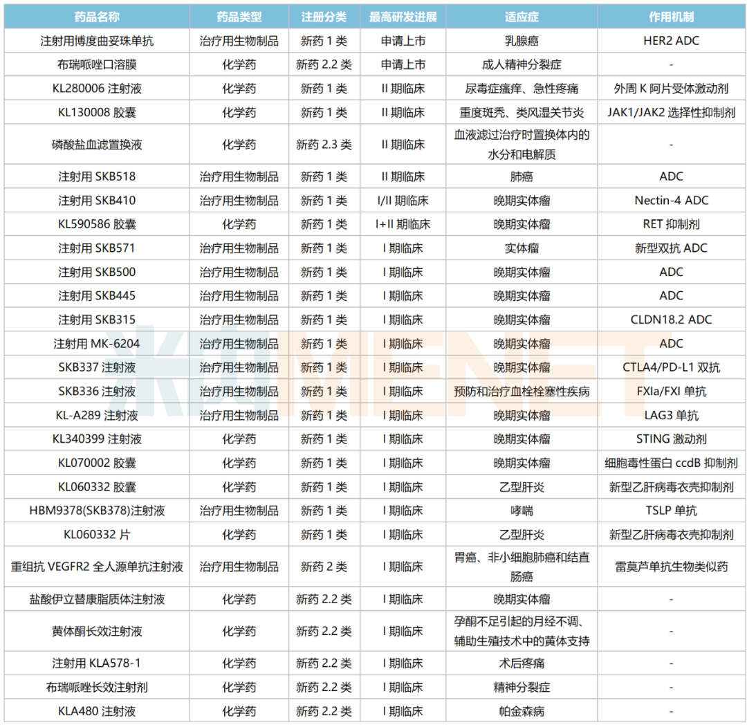 今年以来,科伦药业国内新药研发进展不断:生物类似药西妥昔单抗注射液获批上市,为国产首家;PD-L1单抗塔戈利单抗注射液、TROP2 ADC注射用芦康沙妥珠单抗获批新适应症;1类新药注射用SKB445、SKB107注射液,以及2.2类改良型新药KLA480注射液、注射用KLA578-1、KLA514-2片、A140注射液等均首次获批临床。