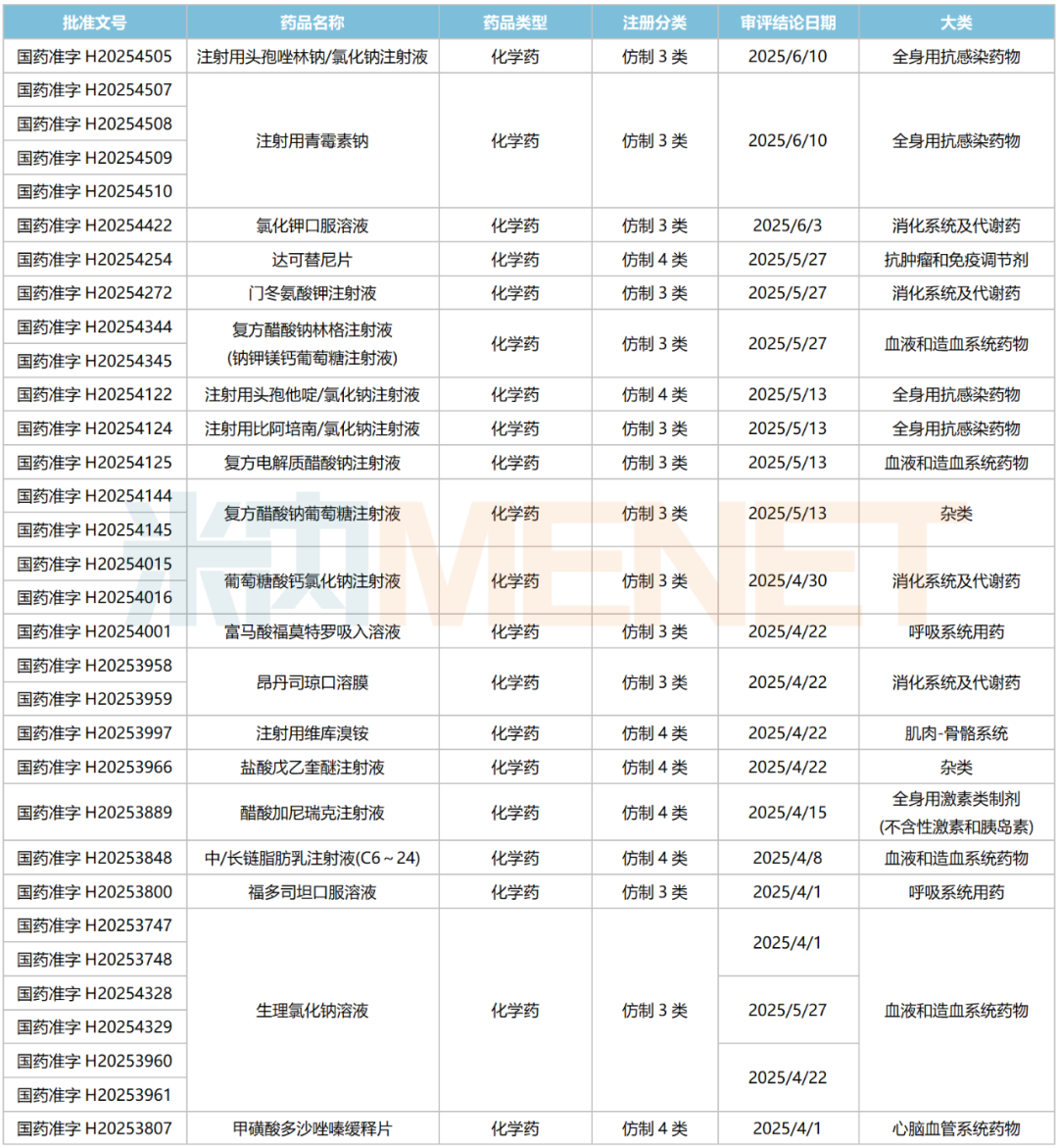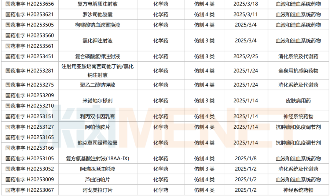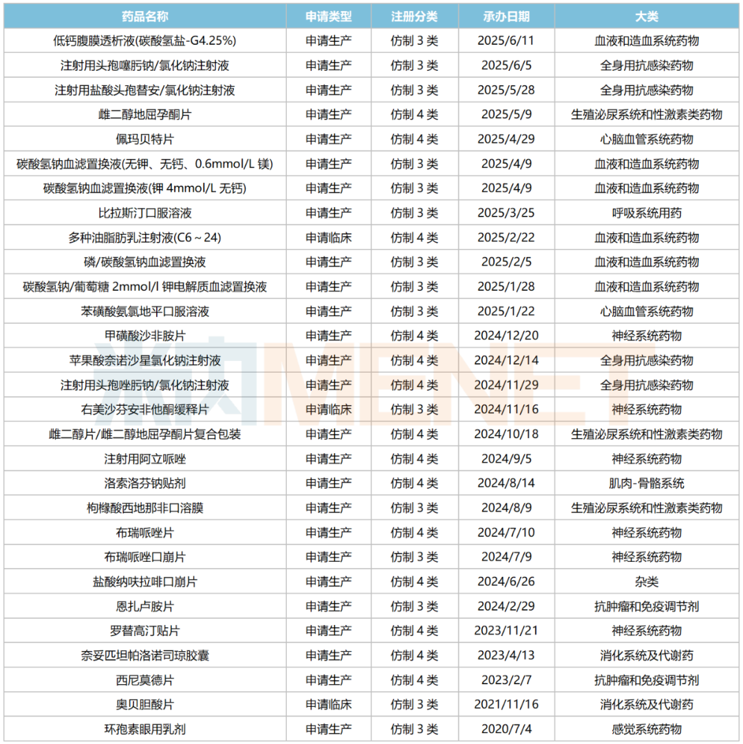 35个品种中,有多个品种为国内首批上市,其中芦曲泊帕片、注射用亚胺培南西司他丁钠/氯化钠注射液、注射用比阿培南/氯化钠注射液等为国内首仿+首家过评,阿帕他胺片、枸橼酸钠血滤置换液、注射用头孢他啶/氯化钠注射液等为国产第2家获批,复方氨基酸注射液(18AA-Ⅸ)、他克莫司缓释胶囊、昂丹司琼口溶膜、复方电解质醋酸钠注射液等为国产第3家获批等。