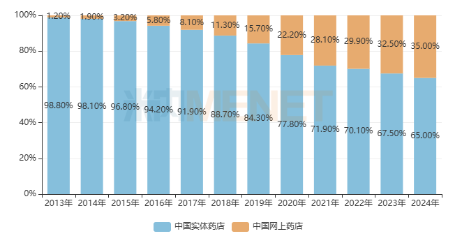 图2:2013-2024年中国实体药店和网上药店(含药品和非药品)销售额占比