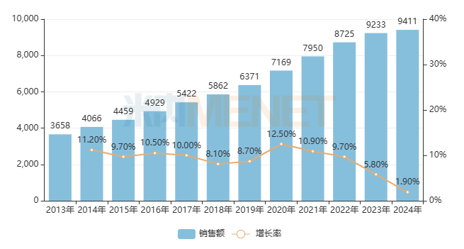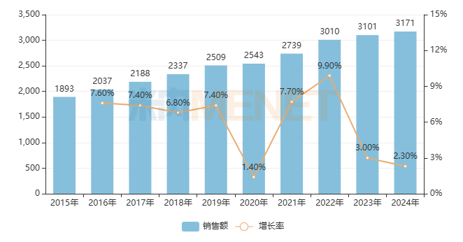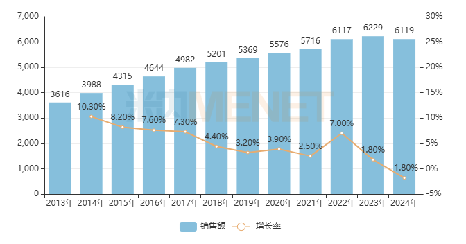 2024年中国网上药店(含药品和非药品)销售规模冲上3292亿元,受中国经济大环境影响,增速首次跌至个位数,同比增长9.6%。实体药店(含药品和非药品)2024年销售规模为6119亿元,首次出现负增长,降幅为1.8%,主要受非药品的销售影响。