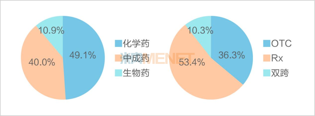 从药品类型看,处方药占比提升2.1个百分点,份额为53.4%,稳坐大半壁江山,非处方药占比下跌1.3个百分点,份额为36.3%,双跨药占比保持在10%左右。