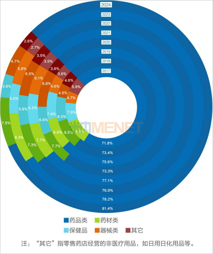 图5:2017-2024年中国实体药店(含药品和非药品)各品类结构变化