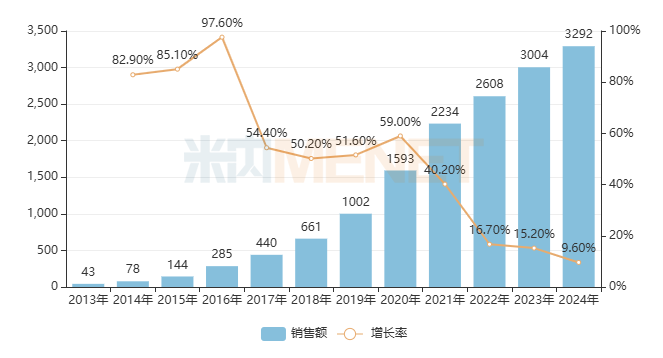图3:2013-2024年中国网上药店(含药品和非药品)销售情况(单位:亿元)