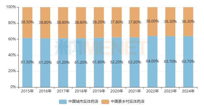 米内网推出的《中国城市实体药店化学药与中成药终端竞争格局》数据显示,2024年“中国城市实体药店”(指:中国所有地级及以上城市实体药店)药品规模占中国实体药店药品规模的63.7%;“中国县乡村实体药店”(指:非地级城市,也就是县乡村实体药店)药品规模占比达36.3%。