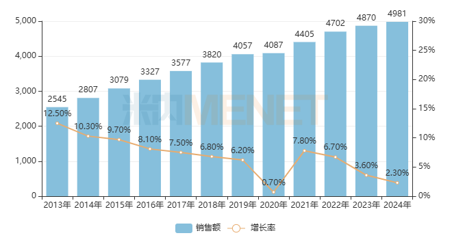 2024年中国实体药店药品销售规模涨至4981亿元,较2023年增长2.3%,近12年来均保持正增长态势。