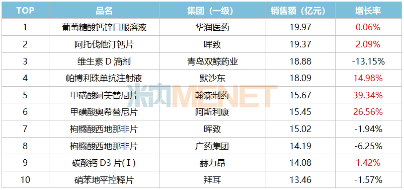 3个消化系统及代谢药品牌上榜:华润医药旗下澳诺(中国)制药的葡萄糖酸钙锌口服溶液2024年以19.97亿元的销售额登上西药TOP1品牌宝座,该品牌的5年复合增长率高达15.28%;青岛双鲸药业的维生素D滴剂2024年销售额下滑,以18.88亿元排在TOP3品牌,该品牌的5年复合增长率为1.47%;赫力昂的碳酸钙D3片(Ⅰ)2024年销售额涨至14.08亿元,排在TOP9品牌,该品牌的5年复合增长率为8.57%。