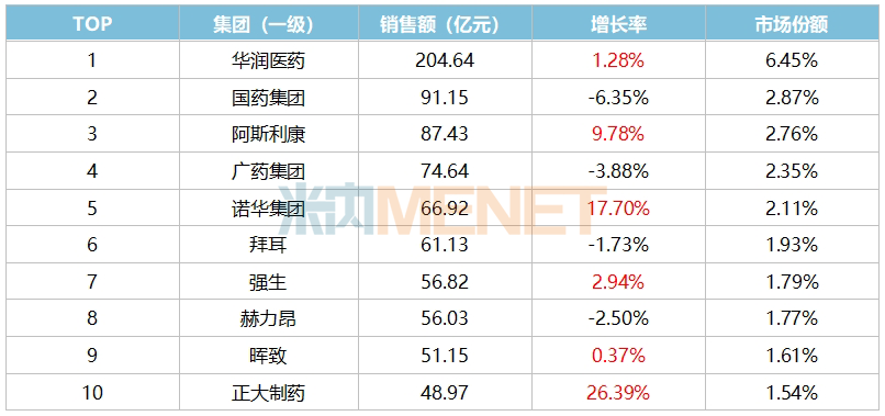 备注:以一级集团统计,如“华润医药”含华润三九、华润东阿、华润双鹤、华润江中等下属企业。