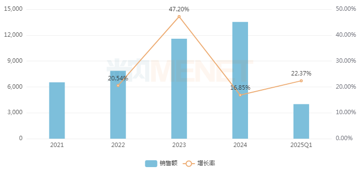养胃舒颗粒是华润三九医药旗下合肥华润神鹿药业的独家中成药,具有滋阴养胃的功效,用于慢性胃炎、胃脘灼热、隐隐作痛等,为国家医保乙类药、OTC甲类(双跨)品种。米内网数据显示,该产品近年来在中国城市实体药店终端销售额逐年攀升,2022-2025Q1同比增速分别达20.54%、47.2%、16.85%和22.37%,市场潜力可期。