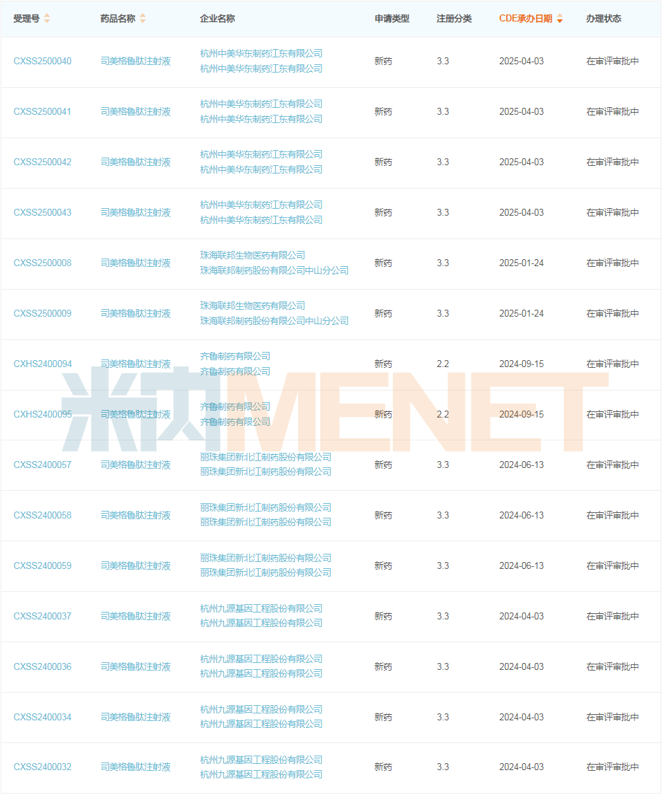 司美格鲁肽注射液是诺和诺德开发的一款长效GLP-1受体激动剂,适用于2型糖尿病治疗和辅助体重管理等,2024年在中国城市实体药店终端销售额超9亿元,2025年一季度已收获超2.6亿元,有望向10亿元大关发起冲击。目前,国内暂无司美格鲁肽注射液生物类似药获批上市,但已有20多家国内企业处于申请临床及以上阶段,其中九源基因、丽珠集团、齐鲁制药、联邦制药、中美华东制药5家已报产在审。