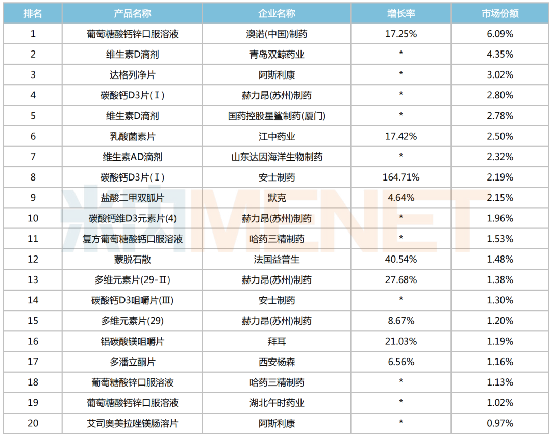 品牌TOP20方面,澳诺(中国)制药的葡萄糖酸钙锌口服溶液蝉联榜首,青岛双鲸药业的维生素D滴剂稳居第二,阿斯利康的达格列净片上升至第三,赫力昂(苏州)制药的碳酸钙D3片(Ⅰ)、国药控股星鲨制药的维生素D滴剂、江中药业的乳酸菌素片先后排在第四、第五和第六位。