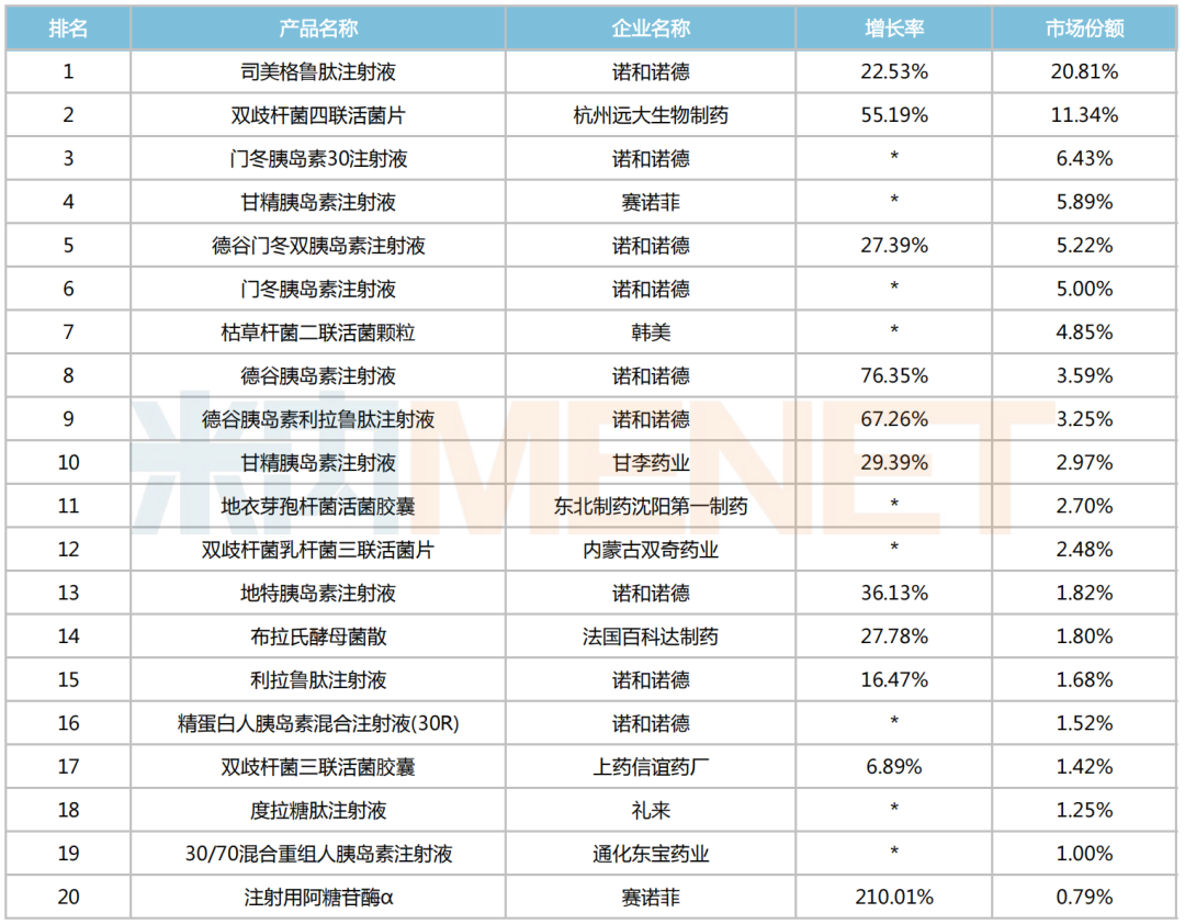品牌TOP20方面,诺和诺德的司美格鲁肽注射液再摘桂冠,杭州远大生物制药的双歧杆菌四联活菌片排名第二,诺和诺德、赛诺菲及韩美等多款胰岛素产品、止泻微生物产品分别位列TOP3-TOP9,甘李药业的甘精胰岛素注射液排在TOP10。