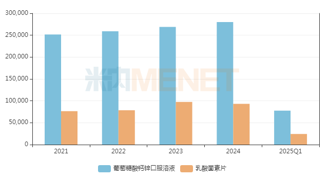 葡萄糖酸钙锌口服溶液、乳酸菌素片2025年一季度在中国城市实体药店终端销售额分别超7.7亿元和2.4亿元,同比增长12.96%和16.2%;其中,澳诺(中国)制药占据葡萄糖酸钙锌口服溶液七成以上的市场份额,江中药业占据乳酸菌素片九成以上的市场份额。