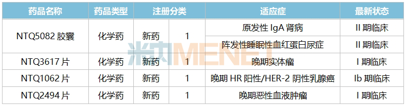 2021年起,南京正大天晴制药陆续提交了4款化药1类新药的临床申请,目前已全部获得了临床批件。其中进度最快的是NTQ5082胶囊,阵发性睡眠性血红蛋白尿症的II期临床在2024年年底启动,而另一个适应症原发性IgA肾病的II期临床在2025年5月启动。此外,NTQ3617片也在今年1月启动了晚期实体瘤的I期临床。