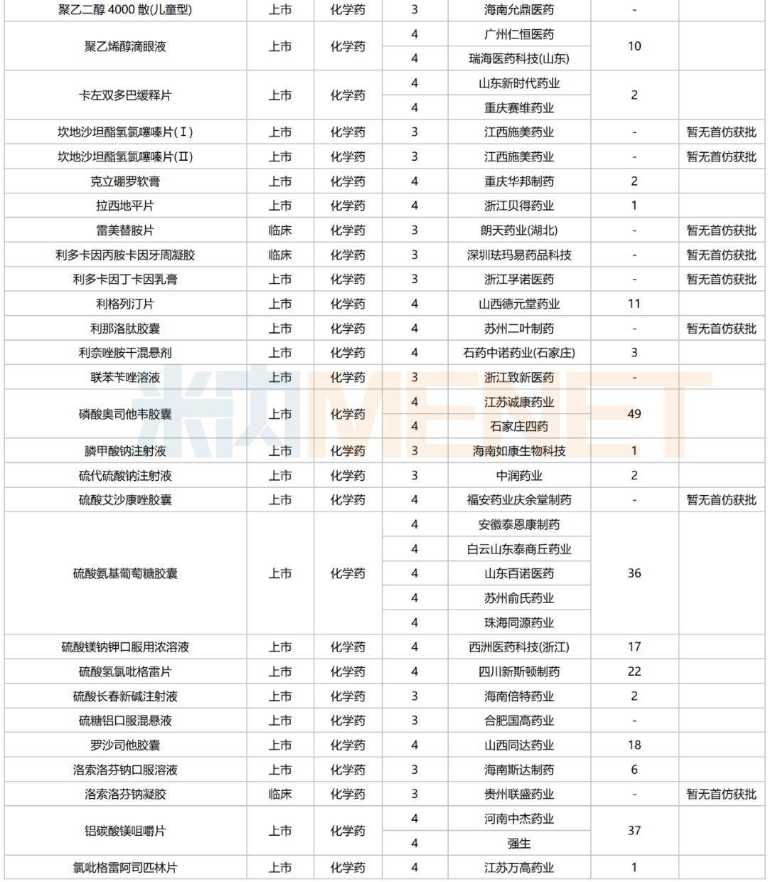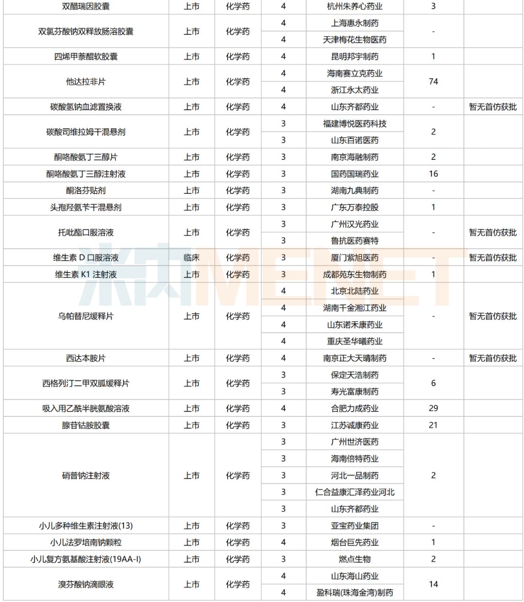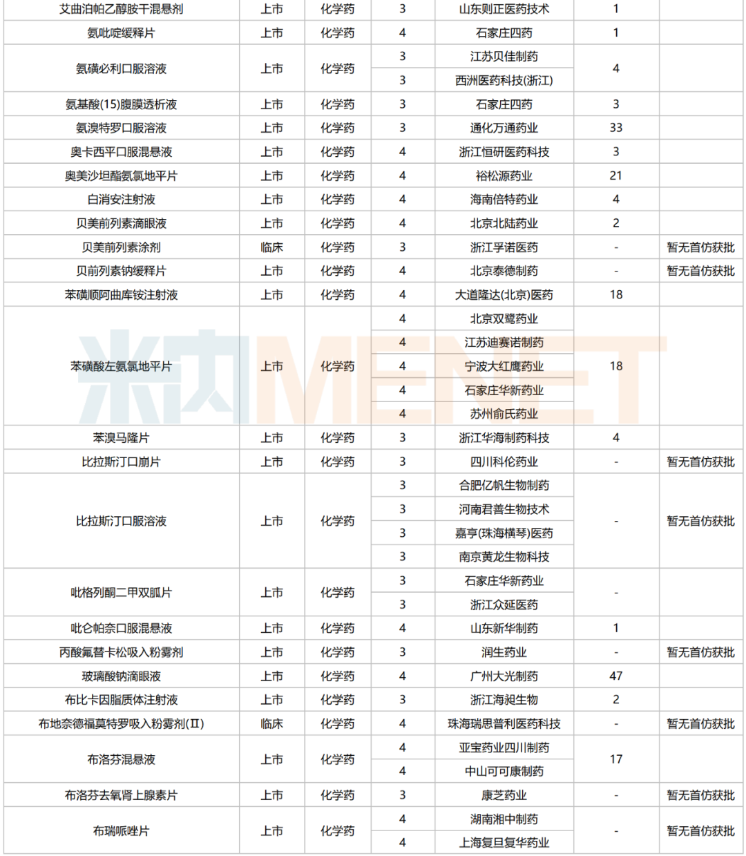 数据来源:米内网中国申报进度数据库(MED)、CDE、NMPA;相关统计字段按药品名称统计,申报企业数按主申报企业统计,时间截至2025年6月30日;获批品种按NMPA批件发布时间统计;药物作用靶点以及适应症整理自公开资料;首仿品种指中国内地首仿品种。