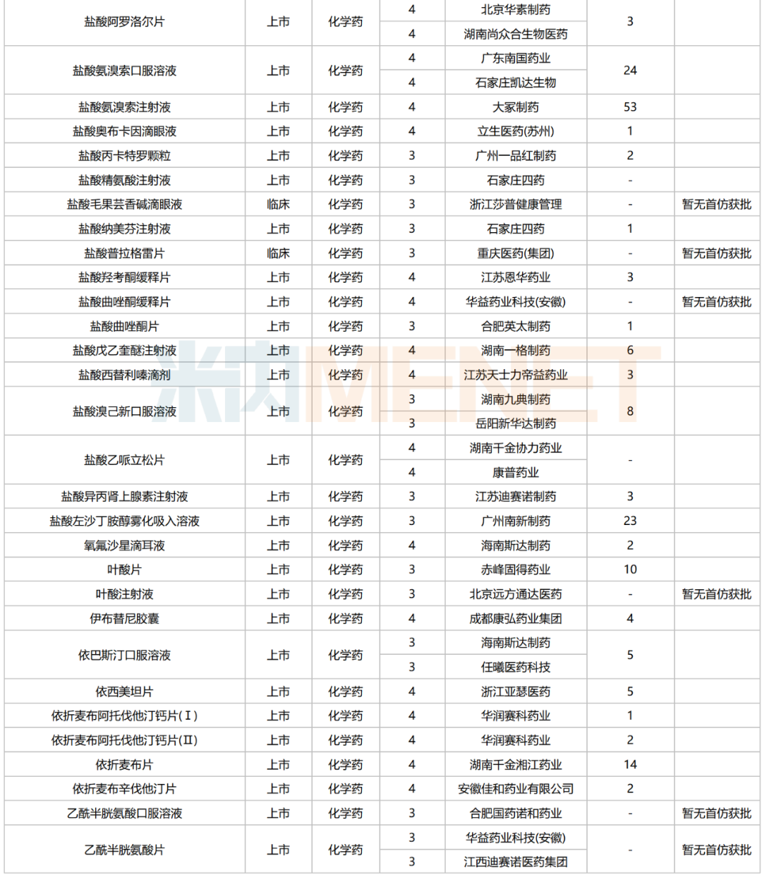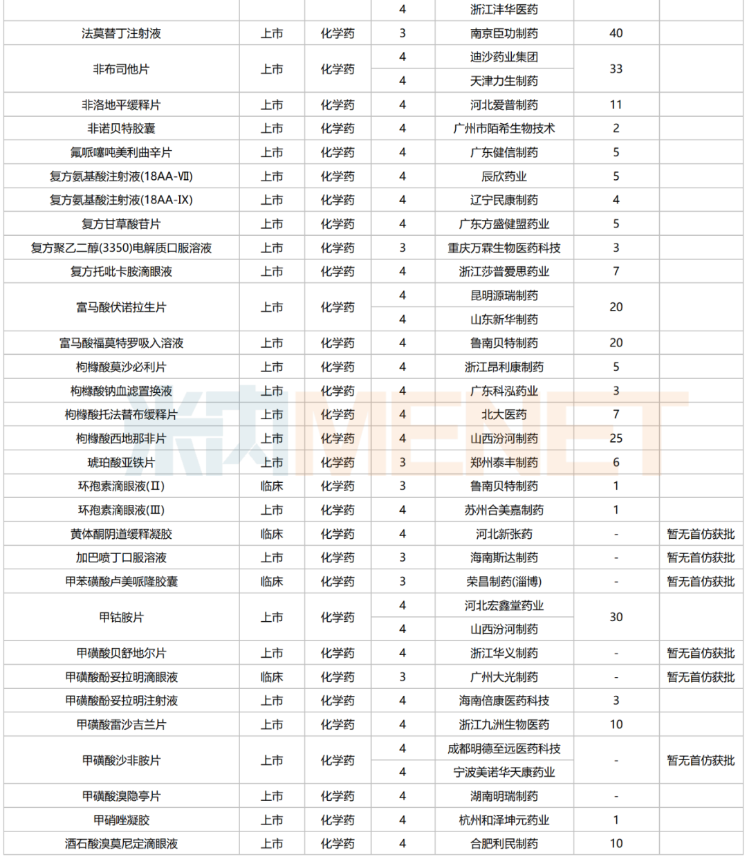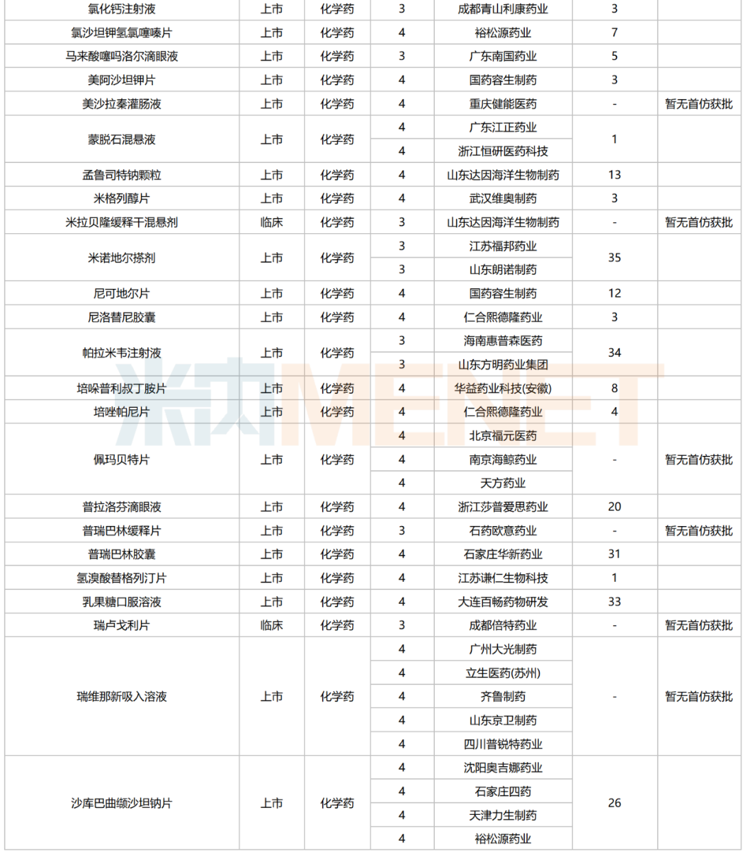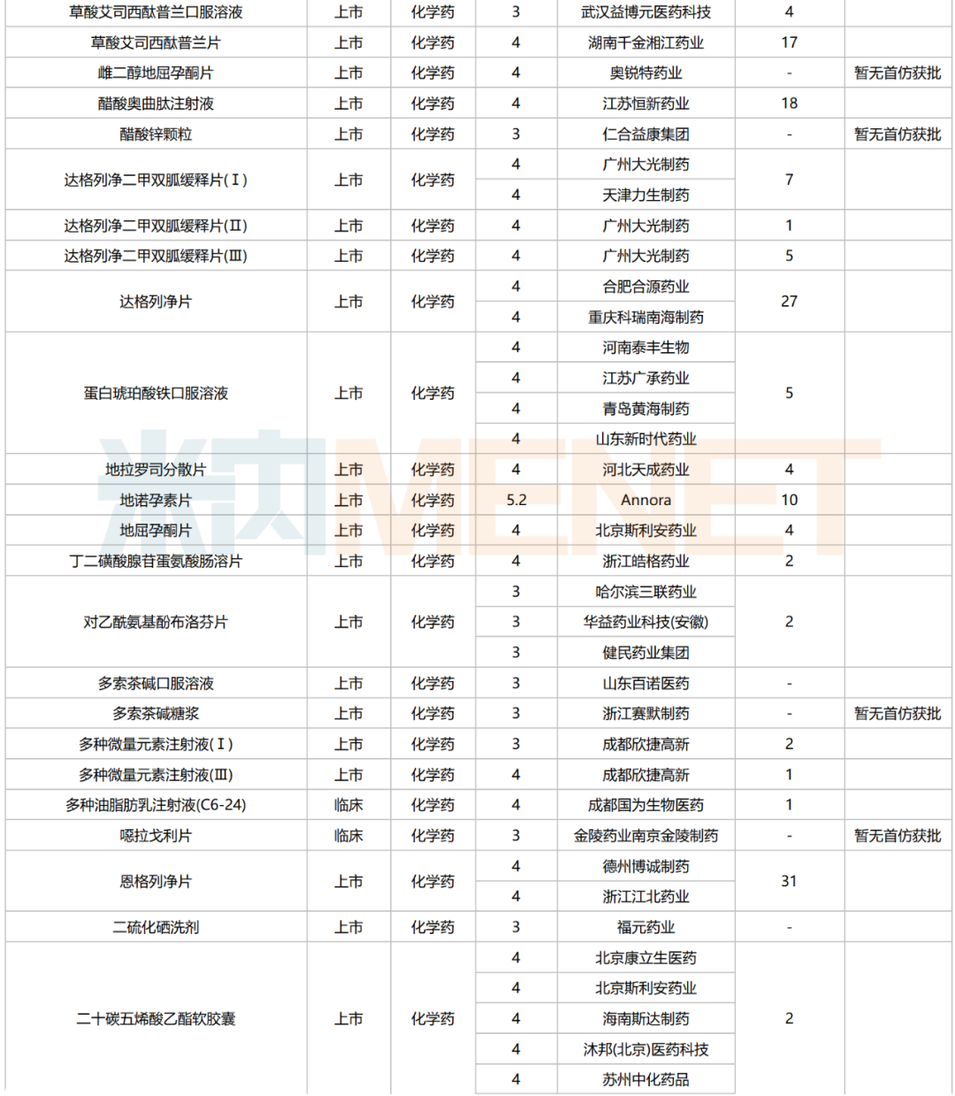 数据来源:米内网中国申报进度数据库(MED)、CDE、NMPA;相关统计字段按药品名称统计,申报企业数按主申报企业统计,时间截至2025年6月30日;获批品种按NMPA批件发布时间统计;药物作用靶点以及适应症整理自公开资料;首仿品种指中国内地首仿品种。
