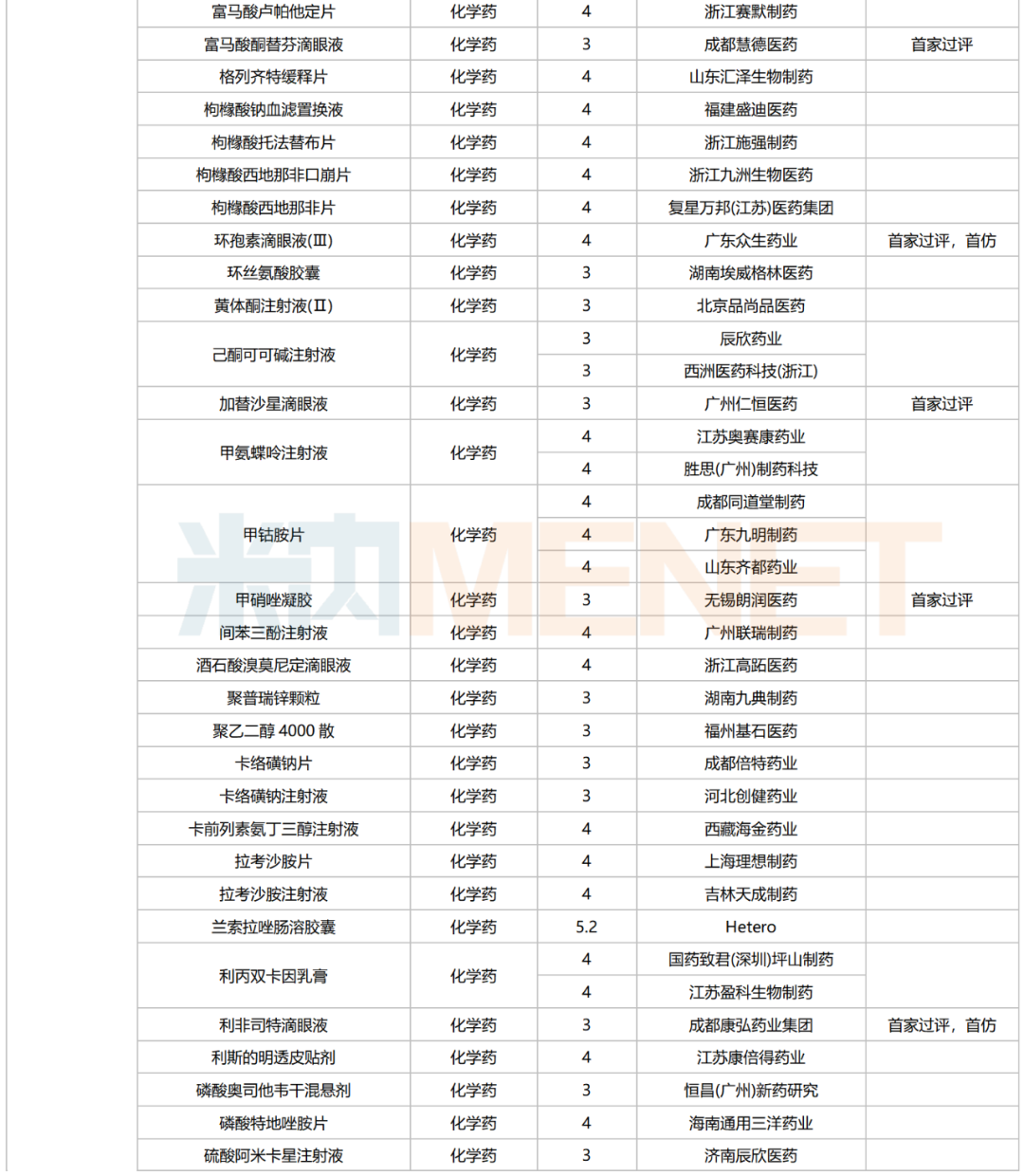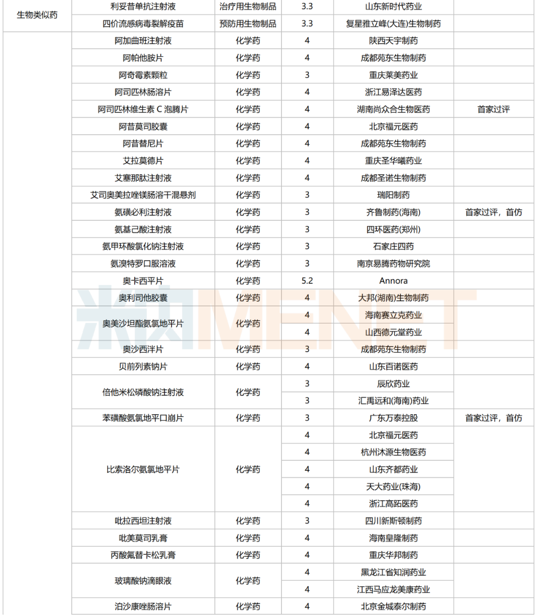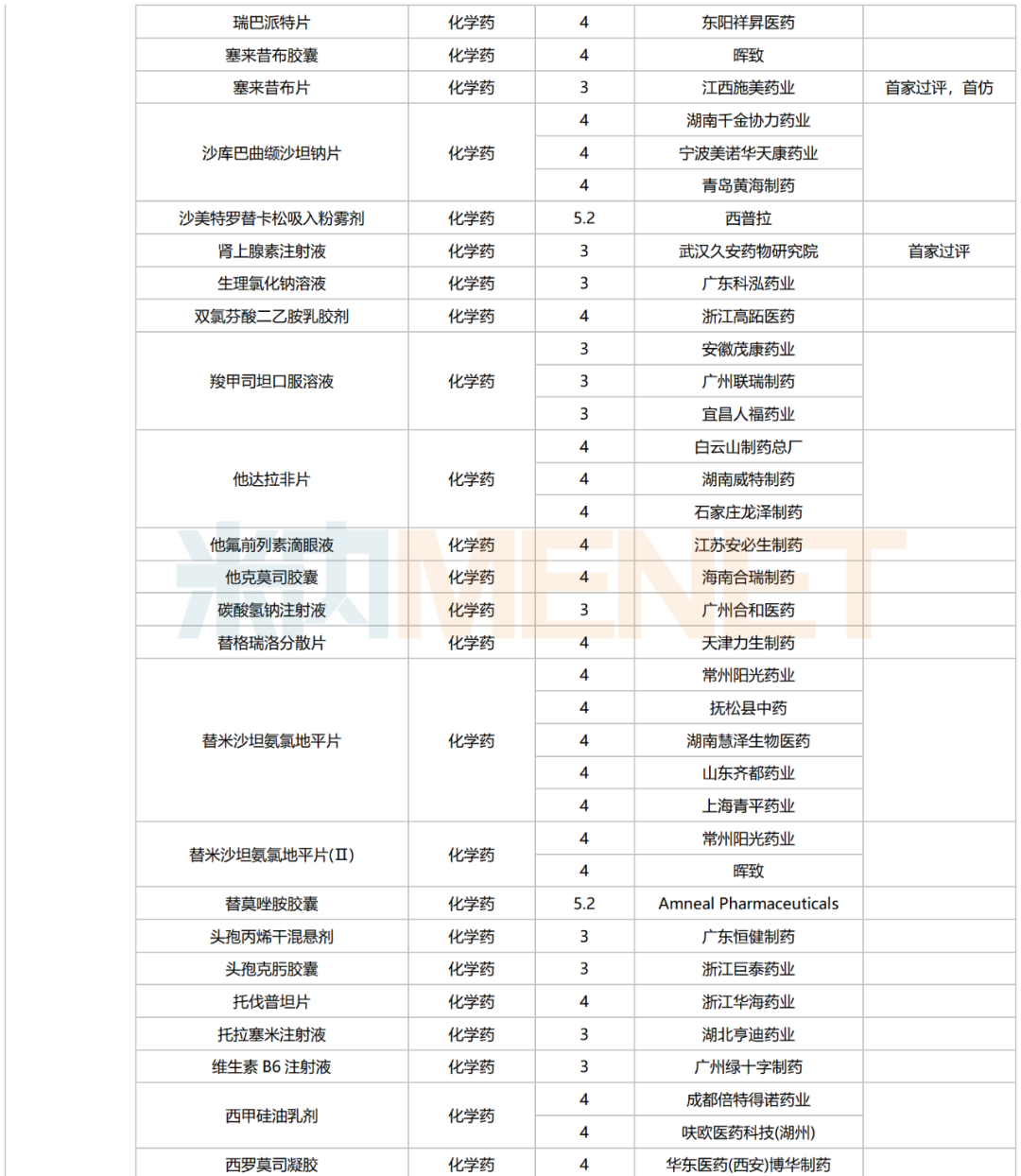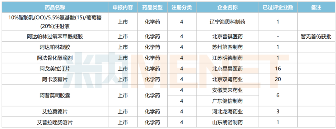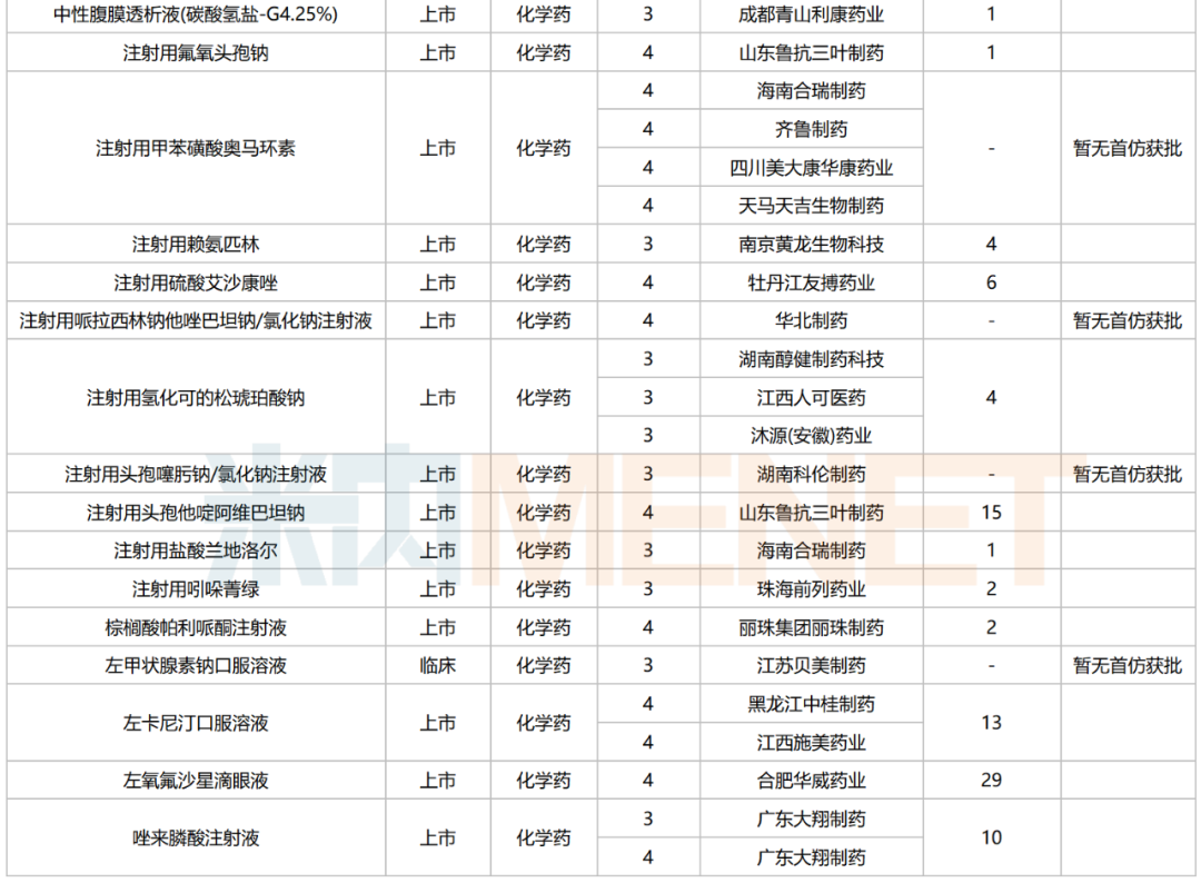 245个品种按新分类仿制申请获批并视同过评,30个品种按存量品种一致性评价补充申请过评。其中22个品种为首家过评,氨磺必利注射液(齐鲁制药(海南))、苯磺酸氨氯地平口崩片(广东万泰控股)、布洛芬氯化钠注射液(陕西丽彩药业)、氟[18F]贝他吡注射液(北京欣翮医药)、复方匹可硫酸钠口服溶液(杭州沐源生物医药)、环孢素滴眼液(Ⅲ)(广东众生药业)、利非司特滴眼液(成都康弘药业集团)、美洛昔康注射液(Ⅲ)(石药中诺药业(石家庄))、门冬氨酸帕瑞肽注射液(远大医药(中国))、培哚普利氨氯地平片(Ⅰ)(山西同达药业)、去氧胆酸注射液(南京迈诺威医药)、塞来昔布片(江西施美药业)、盐酸屈他维林片(江苏联环药业)等13个品种为首仿品种。