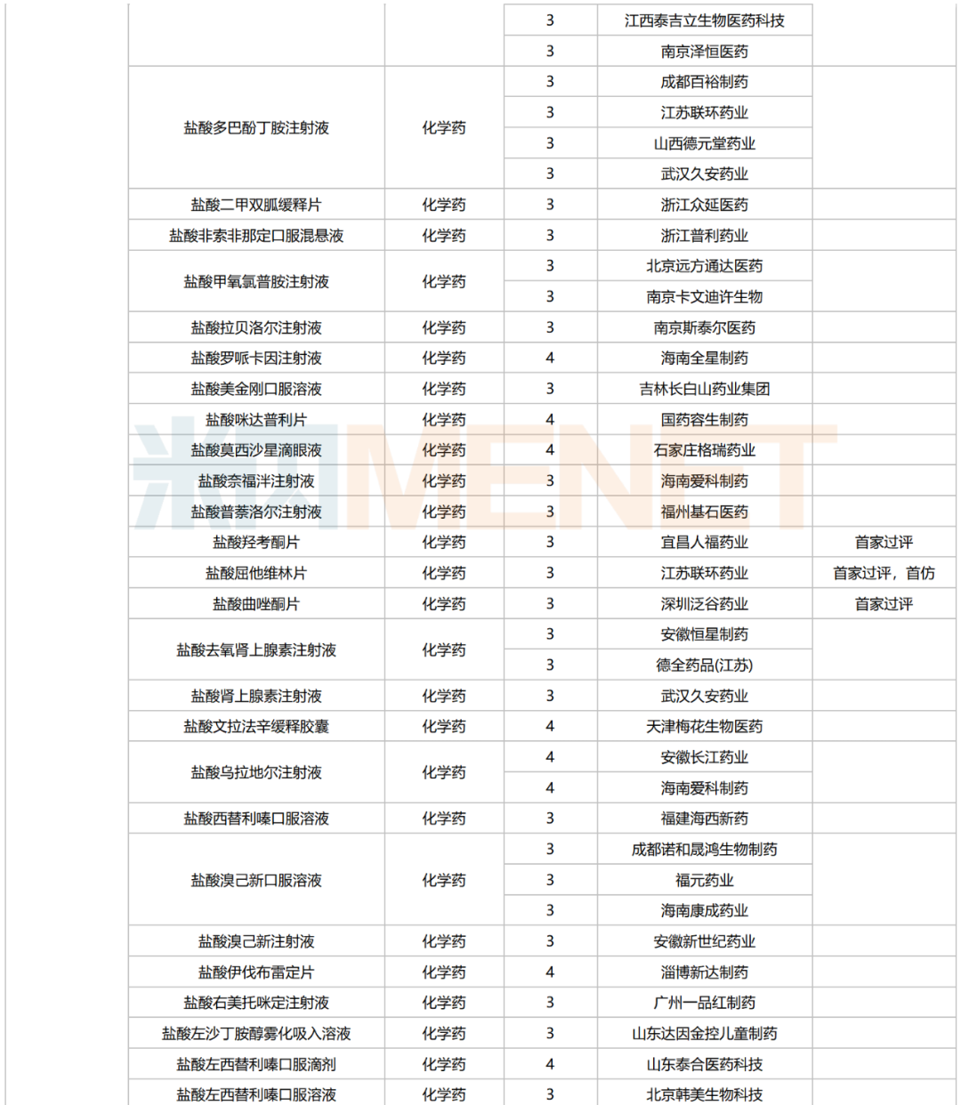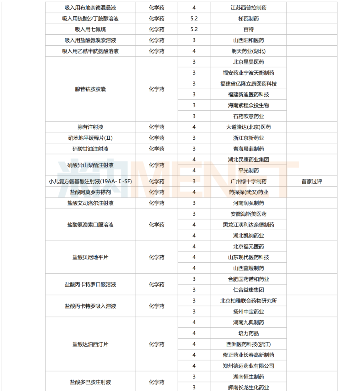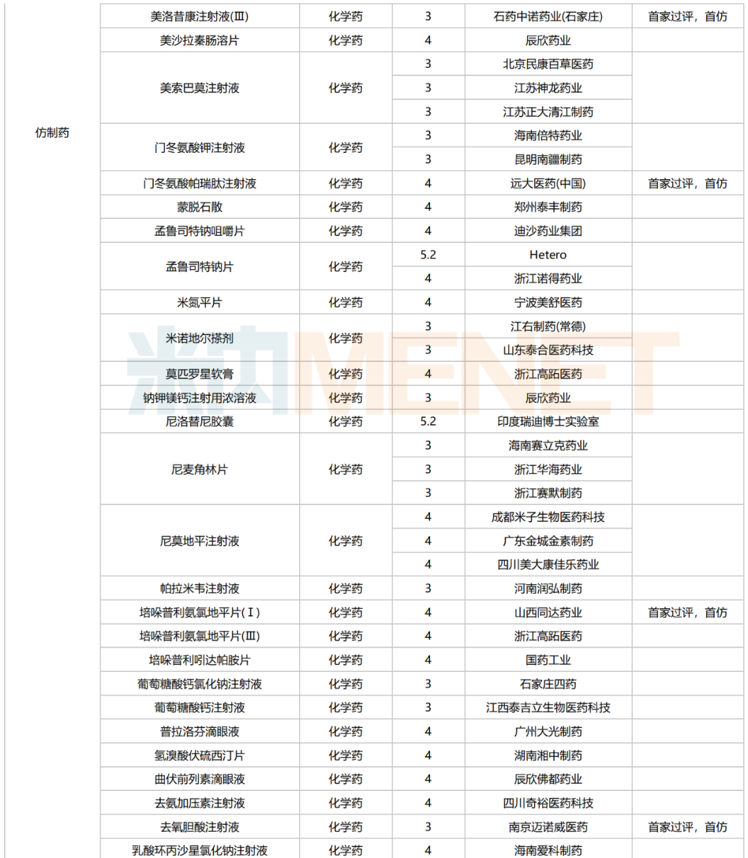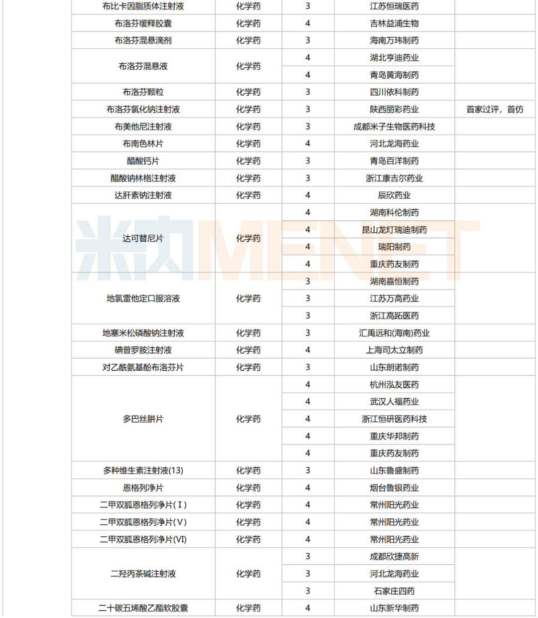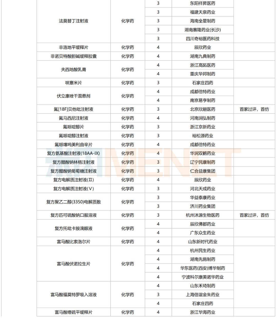 245个品种按新分类仿制申请获批并视同过评,30个品种按存量品种一致性评价补充申请过评。其中22个品种为首家过评,氨磺必利注射液(齐鲁制药(海南))、苯磺酸氨氯地平口崩片(广东万泰控股)、布洛芬氯化钠注射液(陕西丽彩药业)、氟[18F]贝他吡注射液(北京欣翮医药)、复方匹可硫酸钠口服溶液(杭州沐源生物医药)、环孢素滴眼液(Ⅲ)(广东众生药业)、利非司特滴眼液(成都康弘药业集团)、美洛昔康注射液(Ⅲ)(石药中诺药业(石家庄))、门冬氨酸帕瑞肽注射液(远大医药(中国))、培哚普利氨氯地平片(Ⅰ)(山西同达药业)、去氧胆酸注射液(南京迈诺威医药)、塞来昔布片(江西施美药业)、盐酸屈他维林片(江苏联环药业)等13个品种为首仿品种。