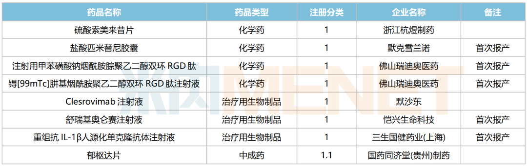 2025年6月有8个1类新药申请上市,化学药有4个,中成药有1个,生物制品有3个。盐酸匹米替尼胶囊(默克雪兰诺)、注射用甲苯磺酸钠烟酰胺腙聚乙二醇双环RGD肽(佛山瑞迪奥医药)、锝[99mTc]肼基烟酰胺聚乙二醇双环RGD肽注射液(佛山瑞迪奥医药)、舒瑞基奥仑赛注射液(恺兴生命科技)、重组抗IL-1β人源化单克隆抗体注射液(三生国健药业(上海))等品种为首次报产。