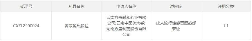 香芩解热颗粒是由方盛制药与云南中医药大学共同开发的一款中药1.1类创新药,具有解表透热、利咽消肿的功效。其临床申请于今年4月获得CDE承办受理,并于近日顺利获批临床,适应症为成人流行性感冒湿热郁表证。