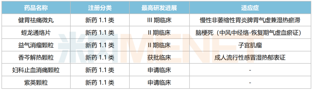 据不完统计,目前方盛制药还有6款中药创新药在国内处于申请临床及以上阶段,聚焦心脑血管科、妇科、儿科、消化科、呼吸科等领域,其中健胃祛痛微丸处于III期临床,用于慢性非萎缩性胃炎脾胃气虚兼湿热瘀滞所致胃脘疼痛、神疲倦怠、口苦口干、纳差、胃脘胀满等;蛭龙通络片、益气消瘤颗粒均处于II期临床,分别用于脑梗死(中风中经络-恢复期气虚血瘀证)、子宫肌瘤。