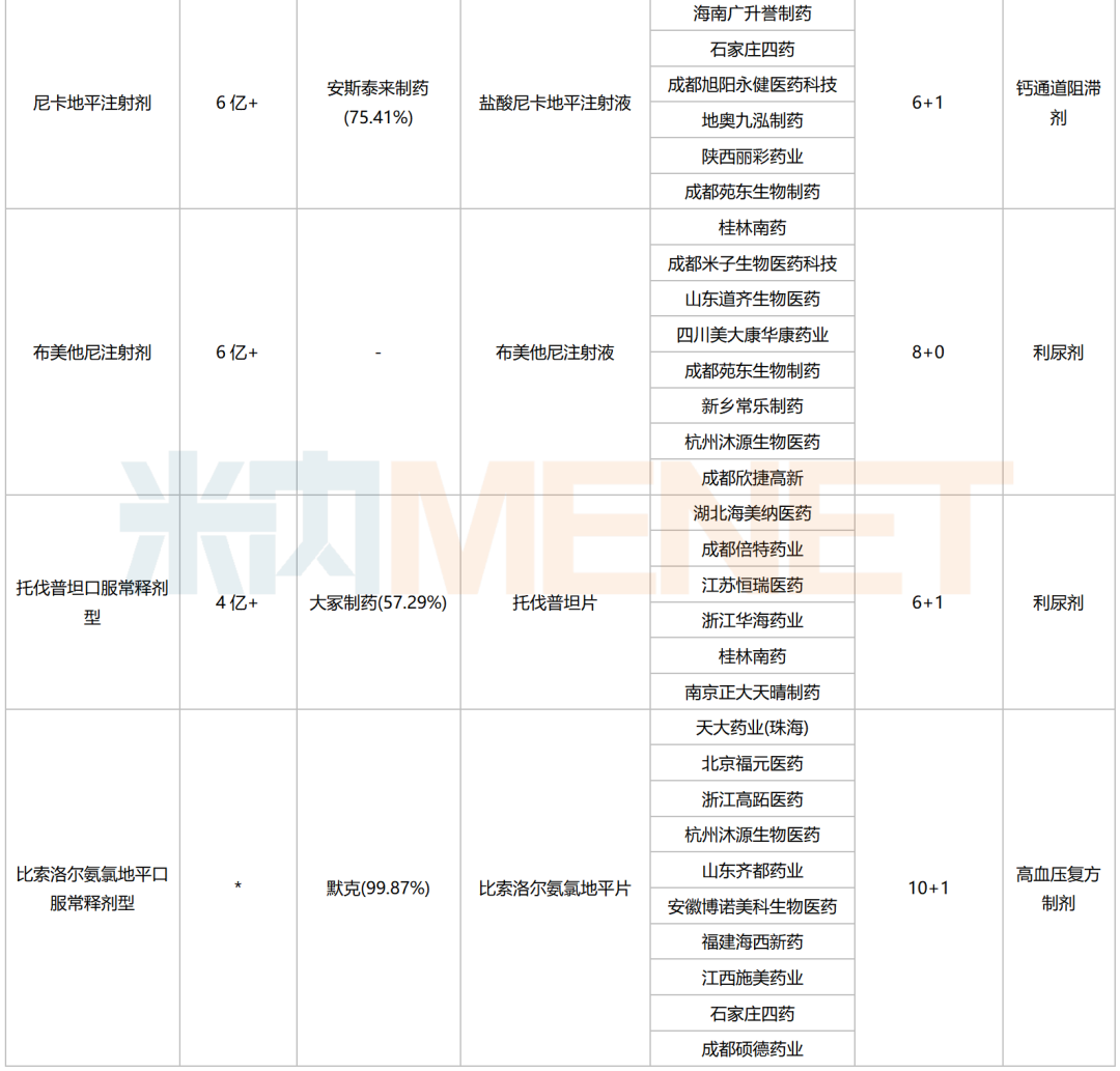 米内网数据显示,目前有9个高血压化药满足国采入围门槛,符合申报资格企业数达7家及以上,包括3个高血压复方制剂、3个钙通道阻滞剂、2个利尿剂、1个专用于抗高血压药。