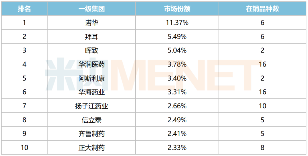 在一级集团排名中,诺华、拜耳、晖致稳居前三,2024年销售额分别超过50亿元、24亿元、22亿元,其中诺华同比增长超过14%;国内企业中,华海药业、信立泰、正大制药等均有个位数增长。