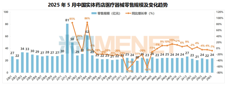2025年5月全国实体药店医疗器械零售规模为24亿元,较4月增加2亿元,与去年同期相比,减少2亿元的规模,医疗器械类别发展相对恒稳。