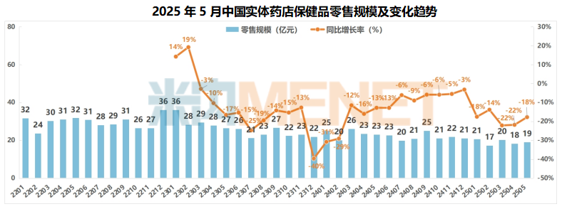 2025年5月全国实体药店保健品零售规模为19亿元,规模较上月增加1个亿,与去年同期相比减少了4个亿。
