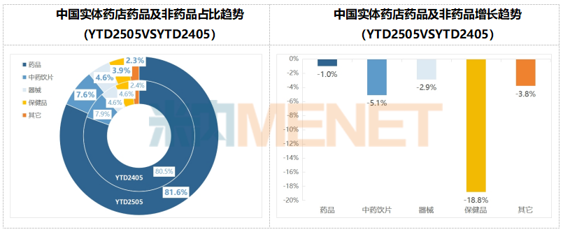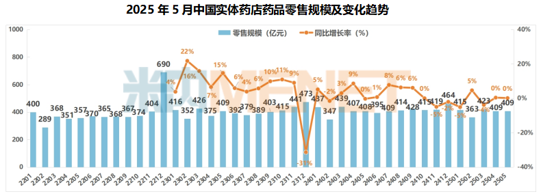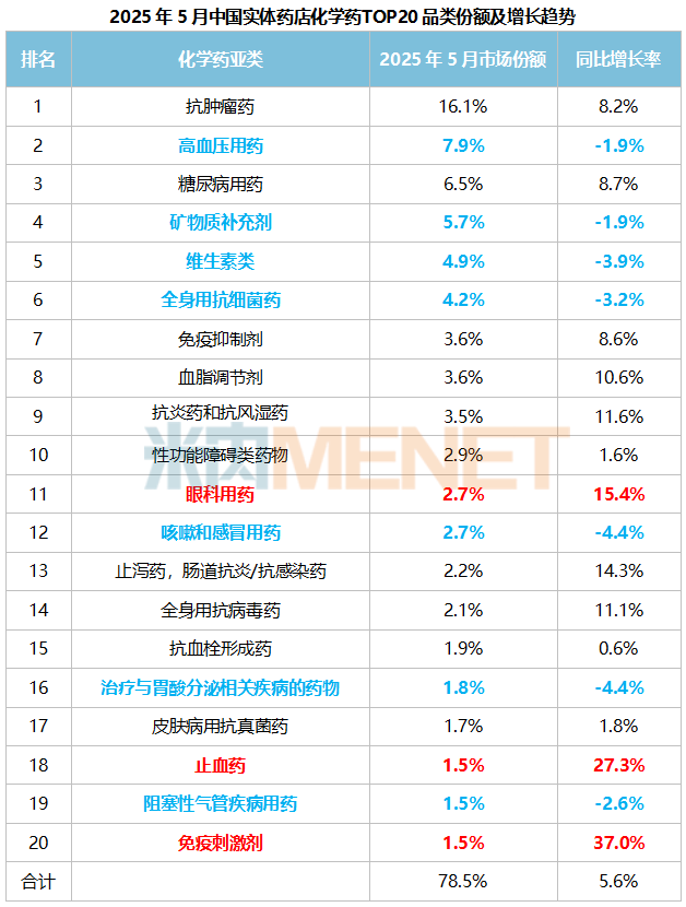 编辑说:米内网数据显示,2025年5月中国实体药店零售规模(药品+非药)为501亿元,环比增长、同比跌幅收窄。中化药TOP20品类中,免疫刺激剂、止血药和眼科用药增速高于15%,祛暑剂、健胃消食类和消肿止痛用药也有超过10%的增长。