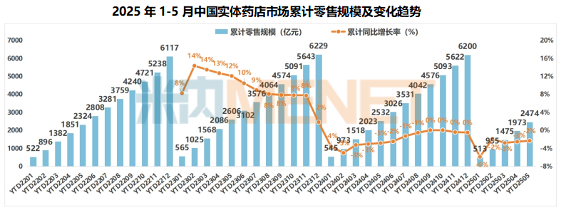 总体分析:5月中国实体药店零售规模(药品+非药)为501亿元,市场下滑趋缓