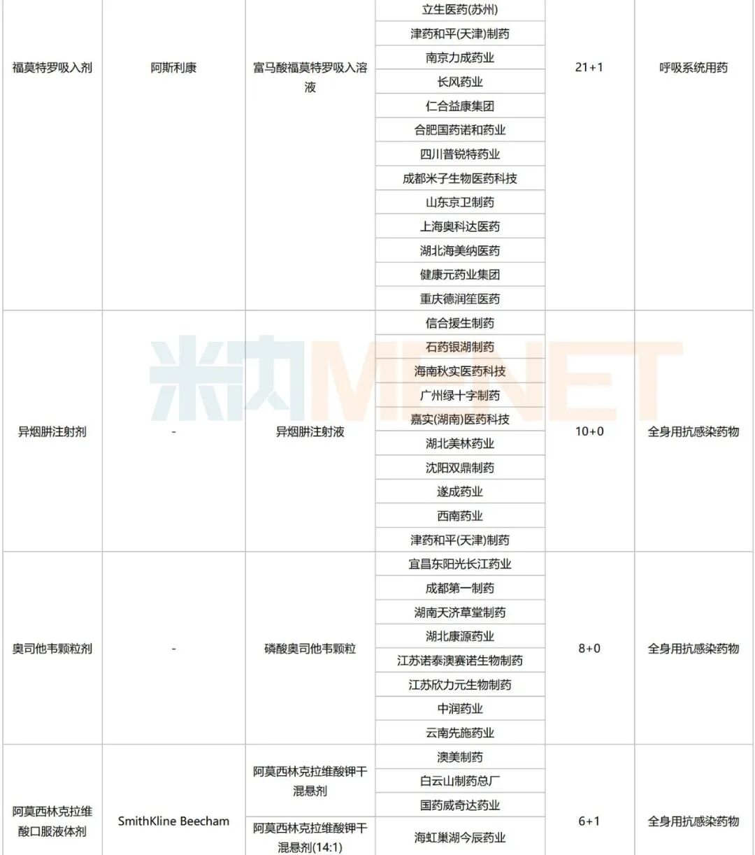 科伦药业、复星医药以15个品种并列第二,其中科伦药业有8个注射剂、6个口服常释剂型、1个吸入剂在列,罗沙司他胶囊、富马酸福莫特罗吸入溶液、注射用维库溴铵、阿戈美拉汀片等为2025年新获批品种。