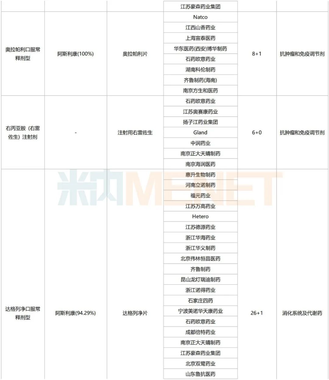 跨国药企中,阿斯利康、大冢制药、雅培、诺华等均有2个及以上的品种涉及。其中,阿斯利康在达格列净片、奥拉帕利片中占据主导地位,2个品种2024年在中国公立医疗机构终端的销售额分别超过52亿元、12亿元。