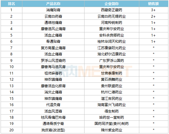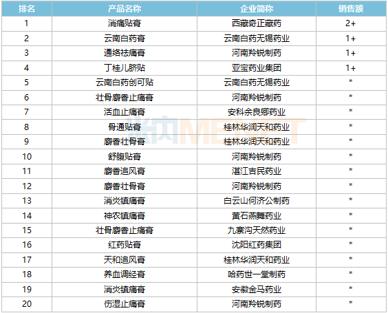 品牌TOP20均为骨骼肌肉系统疾病用药,西藏奇正藏药的消痛贴膏、云南白药无锡药业的云南白药膏、河南羚锐制药的通络祛痛膏位居前三;重庆希尔安药业的麝香追风止痛膏和麝香海马追风膏均在前十。