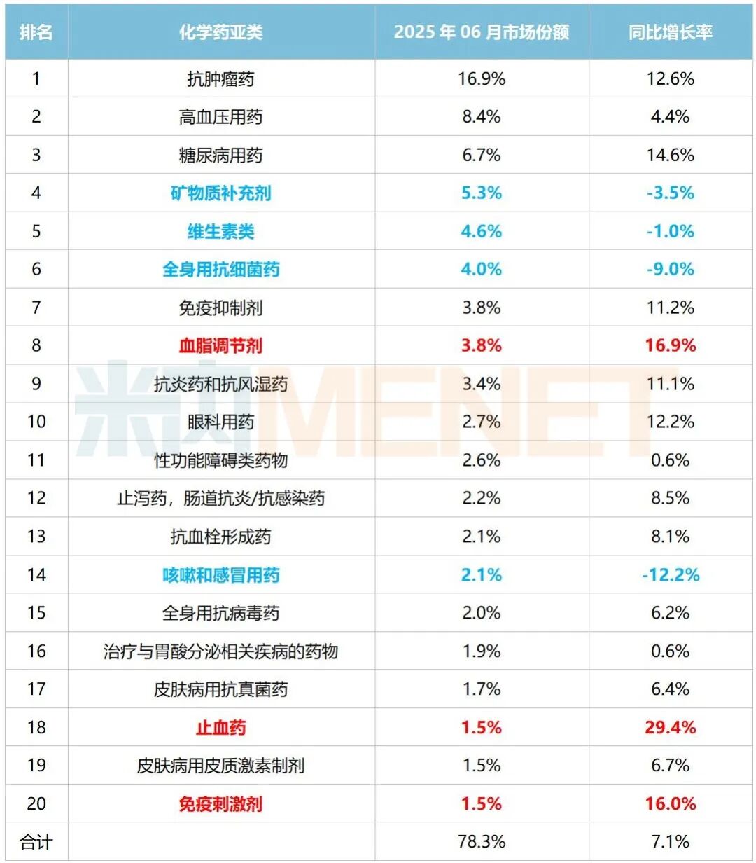 2025年6月,化学药TOP20品类销售规模占78.3%的份额,较上月下降0.2%;从增长率来看,环比下降了2.5%,但与去年同期相比,有接近7%的增长。