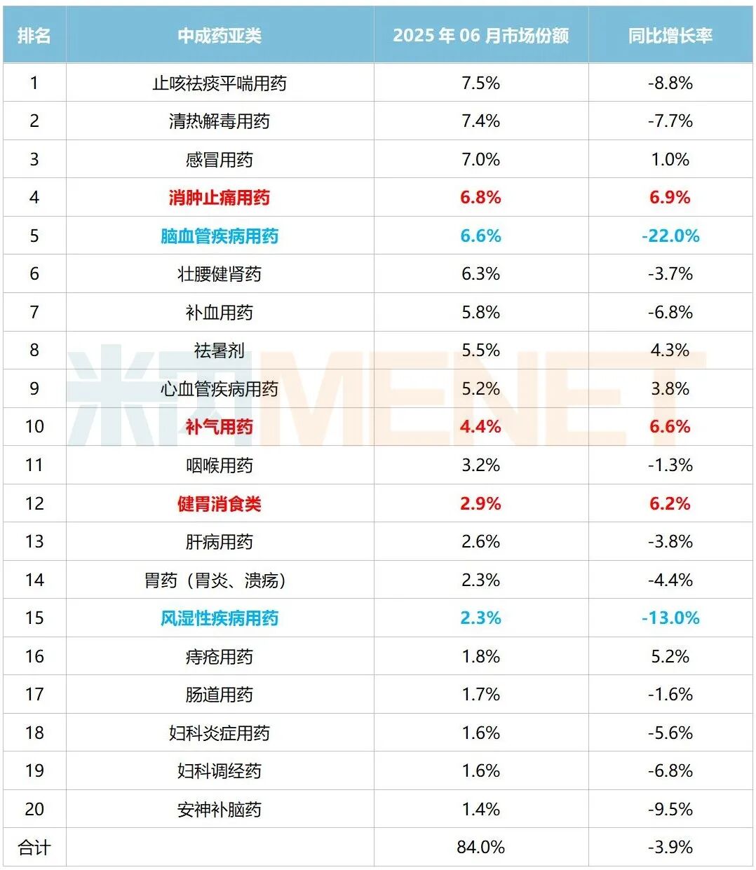 2025年6月,中成药TOP20品类合计份额为84.0%,较上月略降了0.5个百分比。从销售规模增长情况看,较上月下降5.7%,与去年同期相比,下降了3.9%。