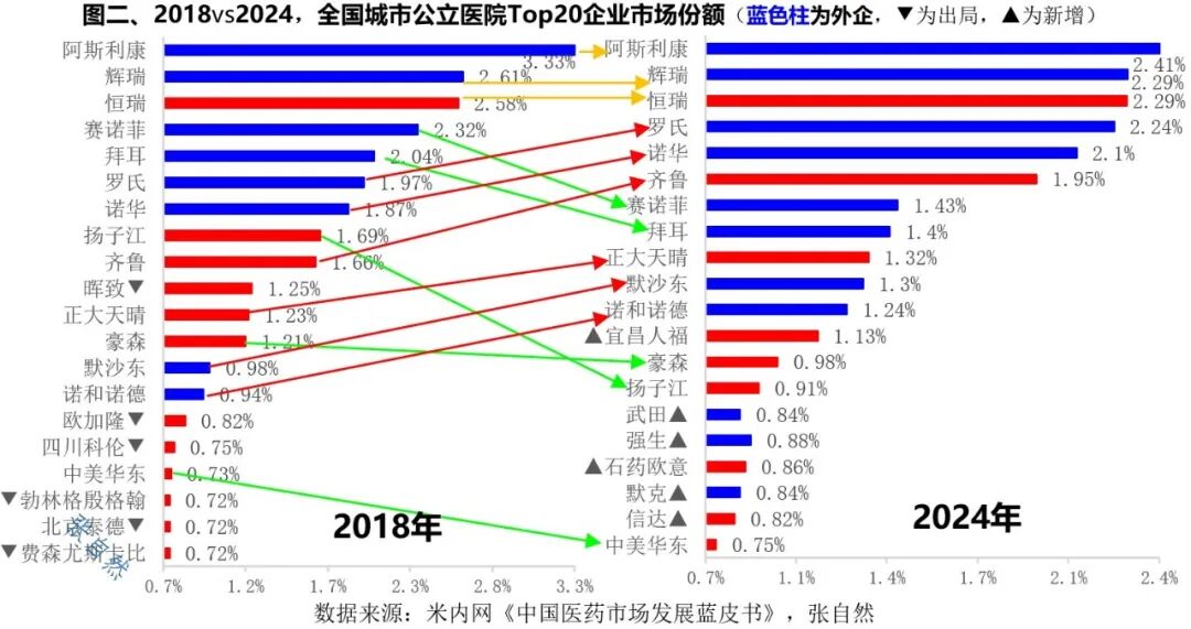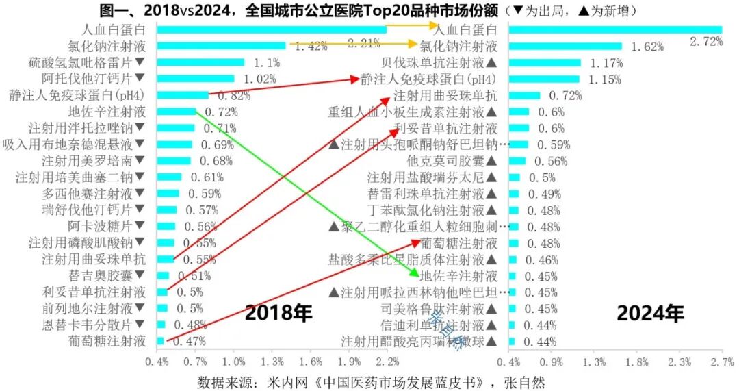 编辑说:2018年开启的集采和国谈颠覆了医药行业格局。本文根据米内网刚刚发布的《2025年度中国医药市场发展蓝皮书》数据,通过七年来(2018~2024)中国城市公立医院化药及生物药TOP20品种、TOP20企业的排名变化,来分析下集采和国谈对医药行业产生的影响。