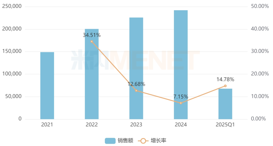 在医保及生物类似药助力下,阿达木单抗注射液近年来在中国三大终端六大市场的销售额快速上涨,2022年突破20亿元,2023年超过22亿元,2024年超过24亿元,2025年一季度上半年继续以约15%的增速保持增长。