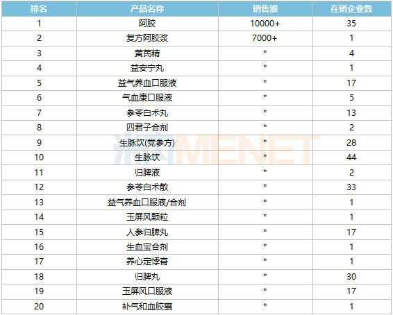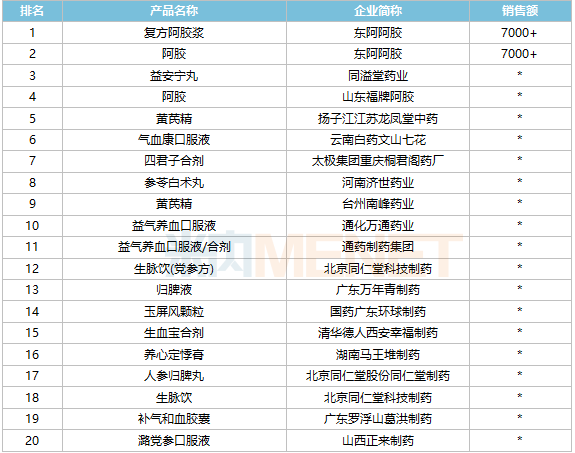 品牌TOP20中,东阿阿胶的阿胶和复方阿胶浆销售额均超过7000万元;广东万年青制药的归脾液、北京同仁堂股份同仁堂制药的人参归脾丸、广东罗浮山葛洪制药的补气和血胶囊等5个为新上榜品牌。