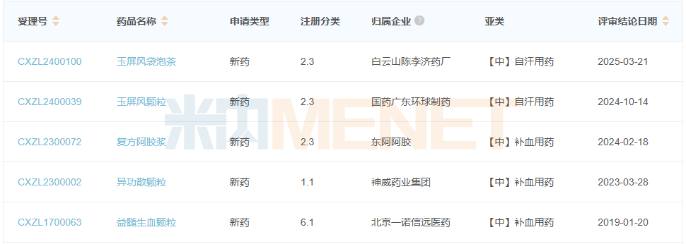 今年3月,白云山陈李济药厂的玉屏风袋泡茶获批临床,开展用于桥本甲状腺炎亚临床甲减及临床甲减经LT4治疗甲功正常脾肺气虚证的临床试验。资料显示,该产品为已上市的中药复方制剂,功能主治为益气、固表、止汗,用于表虚不固,自汗恶风,面色㿠白,或体虚易感风邪者,此次拟增加功能主治用于桥本甲状腺炎亚临床甲减及临床甲减经LT4治疗甲功正常人群属脾肺气虚证的疲乏等症状的改善。2019年至今,补气补血类中成药并无产品获批和报产在审,仅5个产品获批临床,其中,神威药业的异功散颗粒是中药1.1类新药。