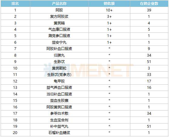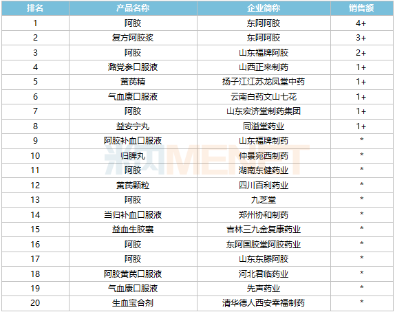 实体药店产品TOP20中,阿胶以超10亿元销售额领跑,复方阿胶浆超过3亿元,黄芪精、气血康口服液等4个产品均超过1亿元。