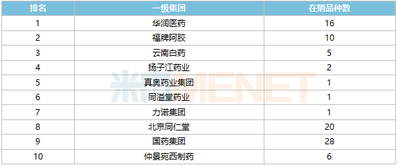 8个独家产品,分别是复方阿胶浆(东阿阿胶)、潞党参口服液(山西正来制药)、益安宁丸(同溢堂药业)、当归补血口服液(郑州协和制药)、益血生胶囊(吉林三九金复康药业)、阿胶黄芪口服液(河北君临药业)、生血宝合剂(清华德人西安幸福制药)、石榴补血糖浆(新疆维吾尔药业)。