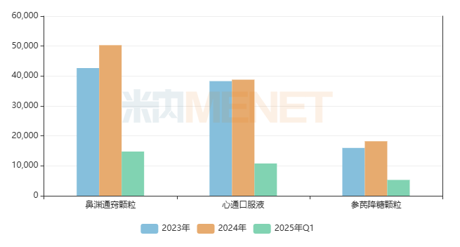 具体来看,中成药占了14个,其中11个为独家产品。小儿消积止咳口服液以6.4亿元的销售额成为鲁南制药集团2024年最畅销的独家中成药;鼻渊通窍颗粒、心通口服液、参芪降糖颗粒2023-2024年保持连续上涨,2025年Q1均有超过10%的涨幅,成功实现“3连涨”。