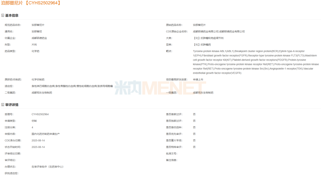 8月14日,CDE官网显示,苑东生物全资子公司成都硕德药业的泊那替尼片以仿制4类报产获受理。该产品是第三代Bcr-Abl激酶抑制剂,用于对既往用药耐药或不耐受的慢性髓性白血病(CML);复发或难治性费城染色体阳性急性淋巴细胞白血病(Ph+ALL);T315I阳性CML或Ph+ALL。