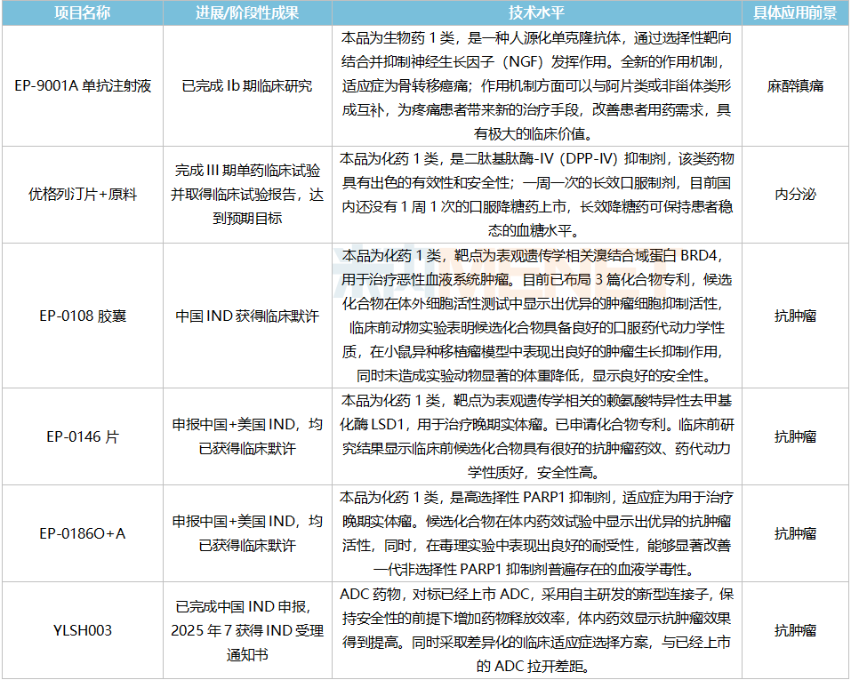 生物药方面,EP-9001A单抗注射液已完成Ib期临床研究;YLSH003已完成临床前研究工作及IND申报准备工作,2025年7月完成IND申报并获受理,该产品是公司首款抗肿瘤生物药1类新药。