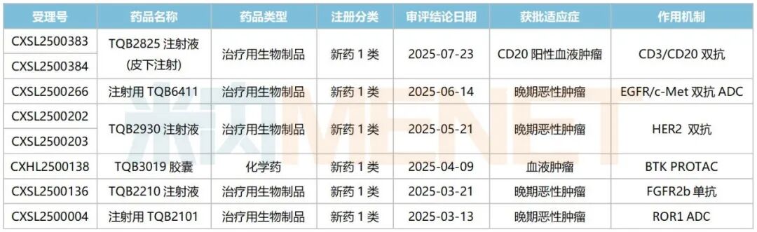 1类新药方面,盐酸安罗替尼胶囊、贝莫苏拜单抗注射液、派安普利单抗注射液等获批新适应症;14款1类新药获批临床,其中TQB2825注射液(皮下注射)(CD3/CD20双抗)、注射用TQB6411(EGFR/c-Met双抗ADC)、TQB2930注射液(HER2双抗)、TQB3019胶囊(BTK PROTAC)、TQB2210注射液(FGFR2b单抗)、注射用TQB2101(ROR1 ADC)为首次获批,且均已启动临床。