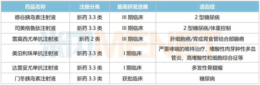 其中,司美格鲁肽注射液、雷莫西尤单抗注射液、美泊利珠单抗注射液、达雷妥尤单抗注射液均暂无国产品种获批;德谷胰岛素注射液获批的国内企业仅有1家。